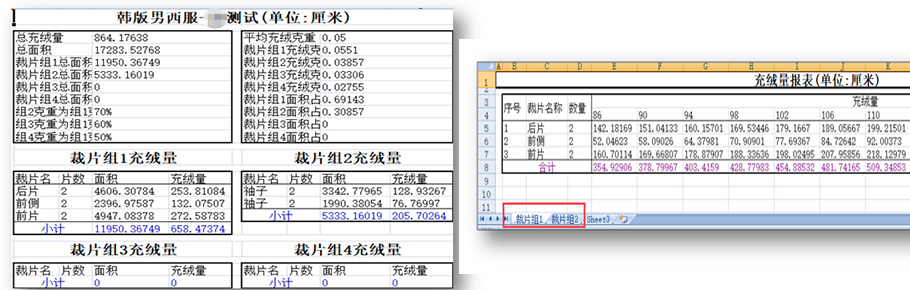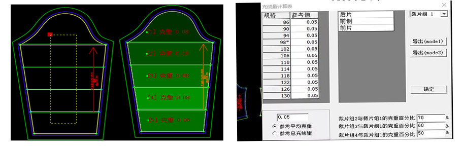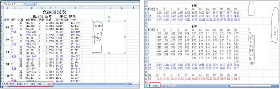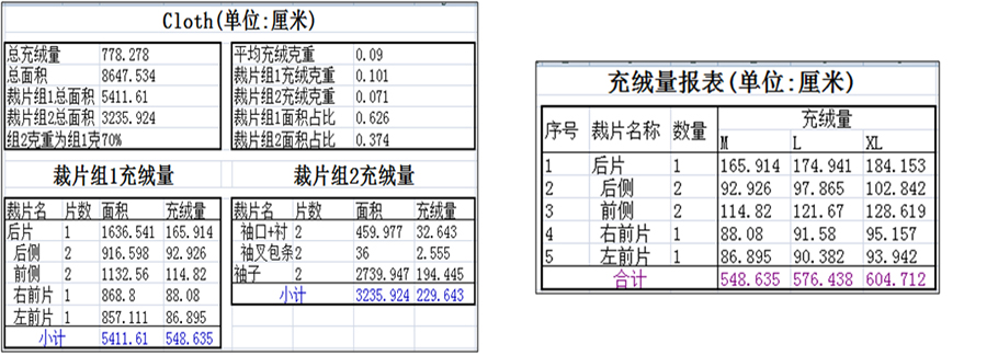 統(tǒng)算充絨:支持參考平均克重與參考總充絨量兩種不同計算方式,還支持不同規(guī)格不同克重或不同總充絨量。只要輸入相關(guān)參數(shù),全自動算出各個規(guī)格,各個充絨部位的充絨量。