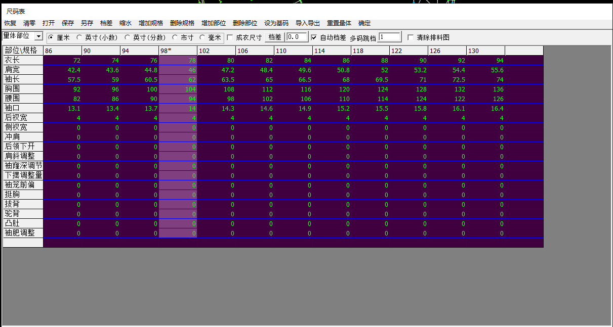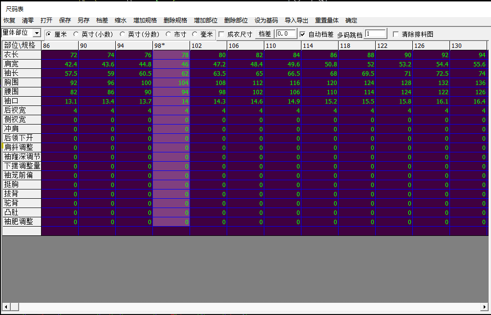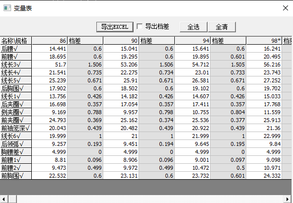 (1)建立號型規格表、設置特體變更參數。裁片直接建模的參數指在設計過程中自行規定的用于滿足特體等變更要求的調節量,例如挺胸凸肚。將這些調節量定義為參數,添加至號型規格表。