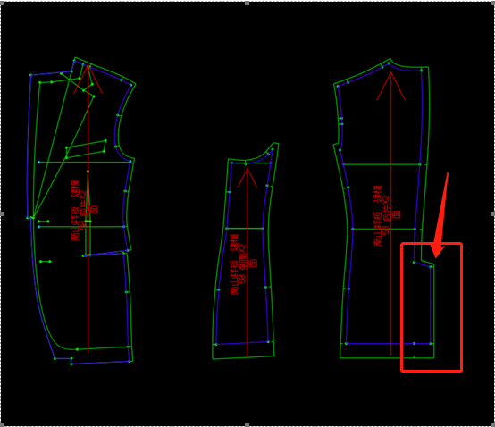 (2)變更控制點確定。樣版修正是對樣片上的控制點和輔助點的變形操作,首先要找到參與修改部位的控制點,以框選的形式對所有參與變更的樣片上的點進行定義,將控制點作為主點,曲線上輔助點作為從點,跟隨主點按比率移動,防止樣版修改線條走形,輔助點的使用是為了確保變形的準確性和合理性。